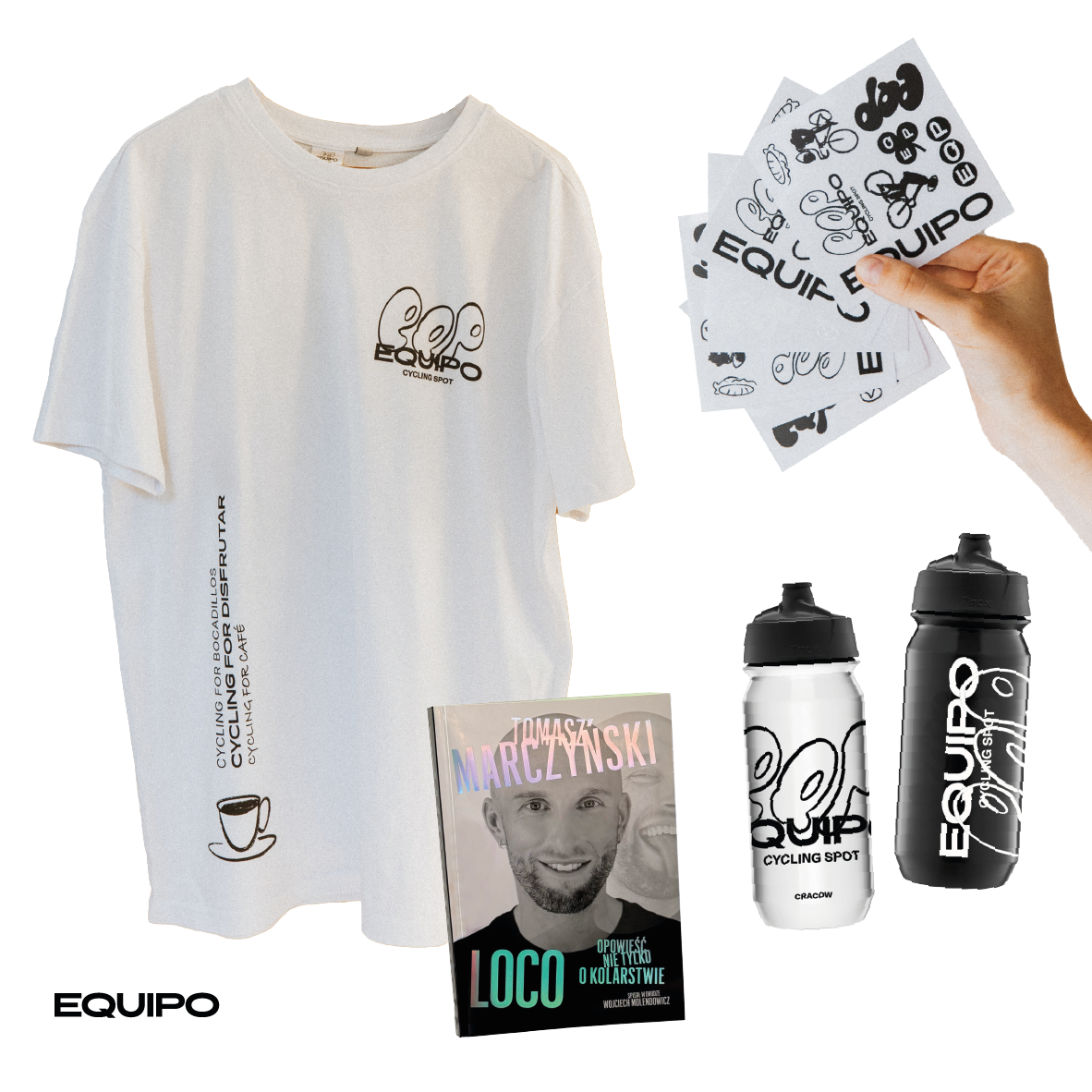 Box nr 4 to prawdziwa gratka dla fanów EQP! W środku znajdziecie naszą kultową bawełnianą koszulkę z logotypem EQP – do wyboru w klasycznej bieli lub czerni. Do tego dokładamy dwa bidony – biały i czarny, idealne na każdą trasę.